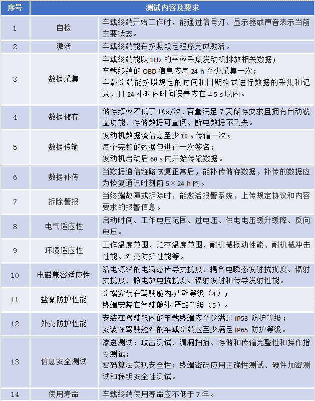 车载终端测试内容分为功能要求和性能要求两大方面,具体测试项目如下: